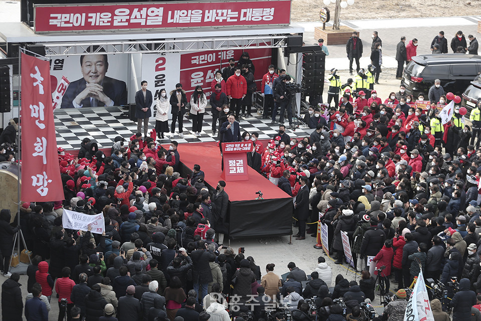 윤석열 국민의힘 대선후보는 지난 22일 오후 충남도청 내포신도시 중심상가 광장에서 바닥 민심잡기에 나섰다.