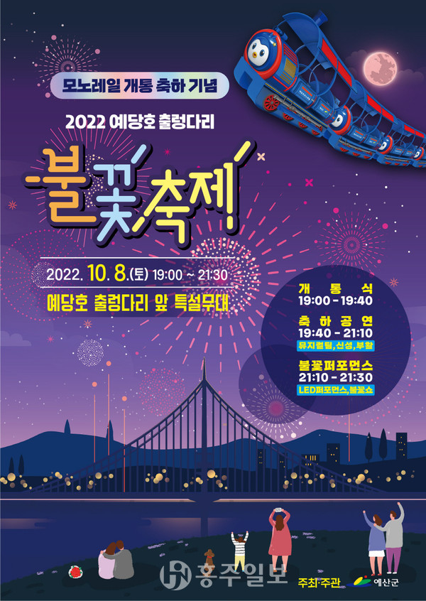 예산군은 예당호의 새로운 관광명소로 거듭날 예당호 모노레일 개통 축하 기념 예당호 불꽃축제를 오는 10월 8일 오후 7시부터 예당호 출렁다리 앞 특설무대에서 개최한다.