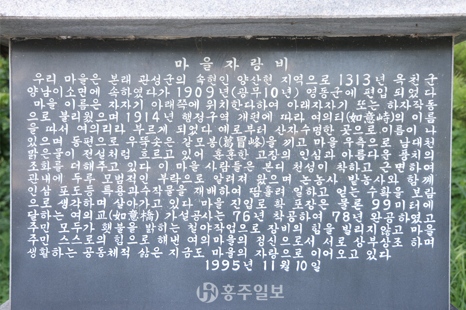 여의리(如意里)마을 자랑비에는 ‘예로부터 산자수명한 곳으로 이름이 나 있으며 동편으로 우뚝 솟은 갈모봉(葛冒峰)을 끼고 마을 우측으로 남대천 맑은 물이 전설처럼 흐르고 있어 훈훈한 고장의 인심과 아름다운 풍치의 조화를 더해 주고 있다.