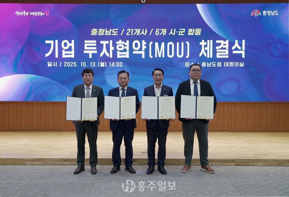 홍성군은 지난 13일 충남도청 대회의실에서 열린 합동 투자협약(MOU) 체결식에서 국내 유망기업 3개사와 436억 원 규모의 투자협약을 체결했다.<사진>