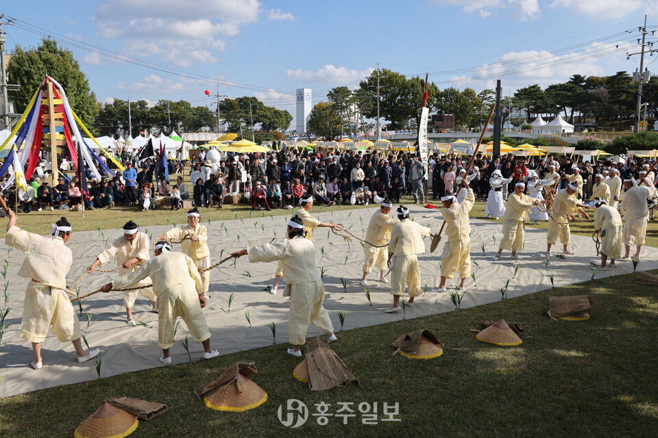 짚단으로 꾸민 테이블과 낮은 의자가 놓인 ‘중앙쉼터·무대’는 소박한 농촌의 분위기를 재현하며, 편안한 휴식공간을 제공해 ‘홍성글바페’의 화려함과 또 다른 온기를 전했다. 이어 무대에서는 전통 풍물과 사자춤 공연 ‘기천제’, 유기농 예술 퍼포먼스와 풍물디제잉, 홍성의 무형문화재 ‘결성농요’ 등 공연이 이어졌다.