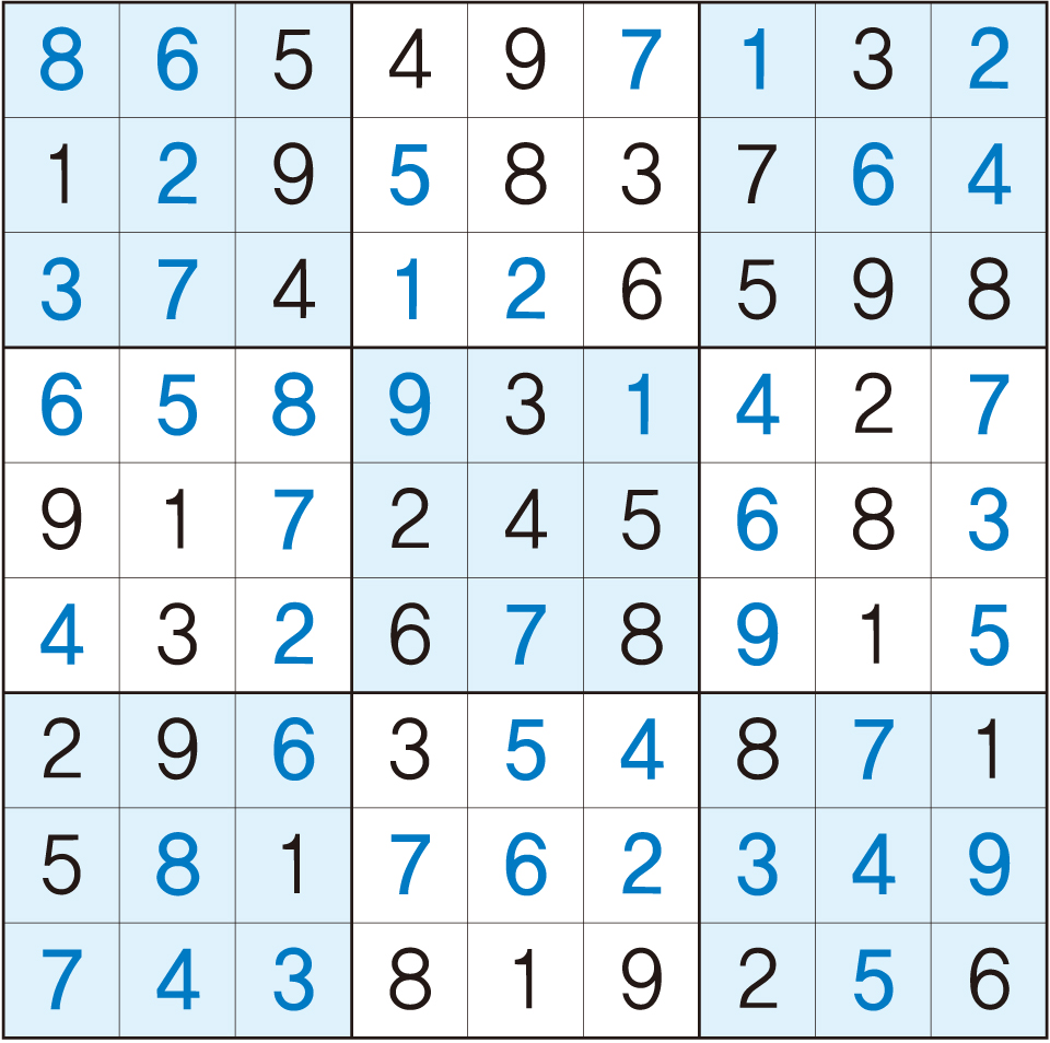 3. 큰 정사각형(9x9) 안에 있는 작은 정사각형(3x3) 안에는 숫자 1~9가 각 한 번씩 들어간다.