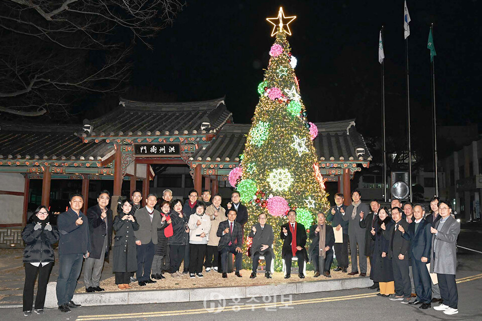 홍성군은 지난 9일 저녁 홍성군청기독교신우회 주관으로 홍성군청 홍주아문 앞에서 2025년 성탄 트리 점등식을 개최했다.<사진>
