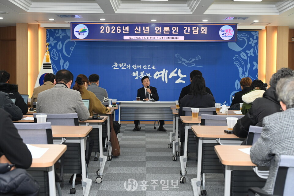 [홍주일보=예산] 예산군은 5일 군청 대회의실에서 최재구 예산군수와 부서장, 언론인 등이 참석한 가운데 2026년 신년 언론인 간담회를 열고 2025년 군정 성과와 2026년 군정 운영 방향을 공유했다.