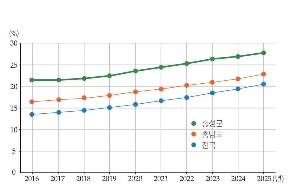 2016년 21.5%였던 홍성군의 노인 비율은 2025년 27.7%로 10년 새 6.2%포인트 상승했다. 같은 기간 전국 평균은 13.3%에서 20.5%로 증가했다. 이미 홍성군은 전국 평균보다 7%포인트 이상 앞선 상태다. 총인구가 정체되거나 감소하는 흐름 속에서도 노인 인구만 꾸준히 늘고 있다는 점은, 고령화가 일시적 현상이 아니라 구조적인 변화임을 보여준다.