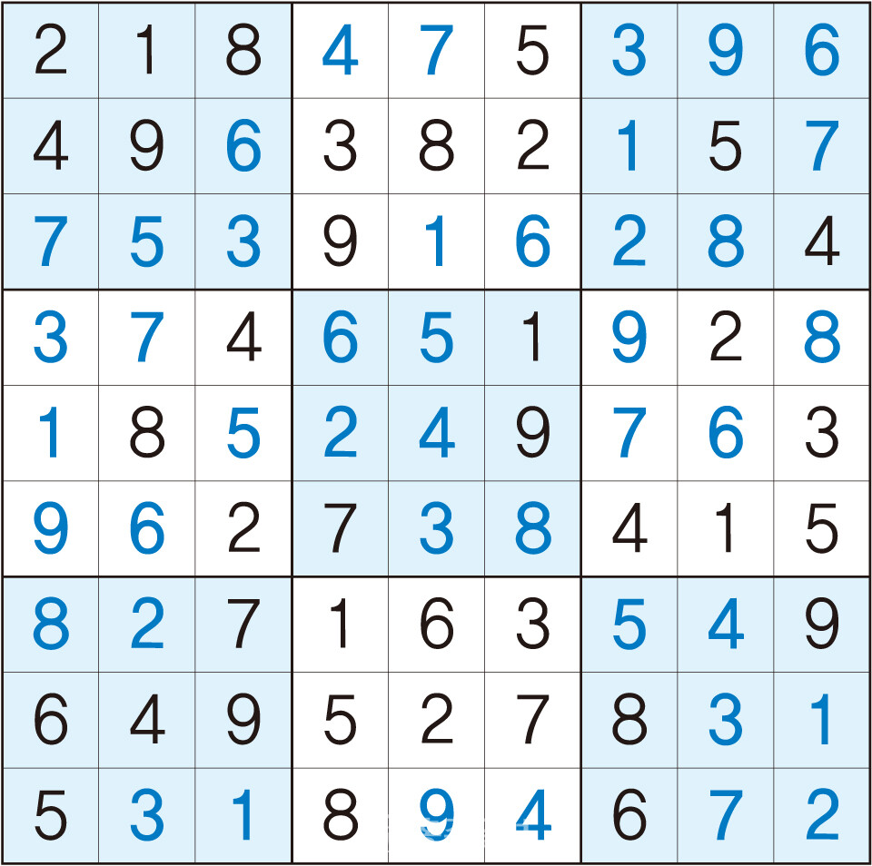 3. 큰 정사각형(9x9) 안에 있는 작은 정사각형(3x3) 안에는 숫자 1~9가 각 한 번씩 들어간다.
