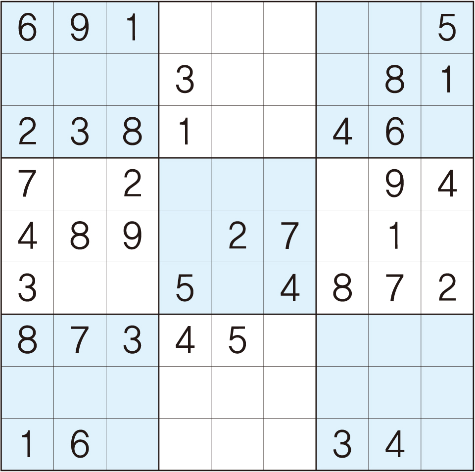 3. 큰 정사각형(9x9) 안에 있는 작은 정사각형(3x3) 안에는 숫자 1~9가 각 한 번씩 들어간다.