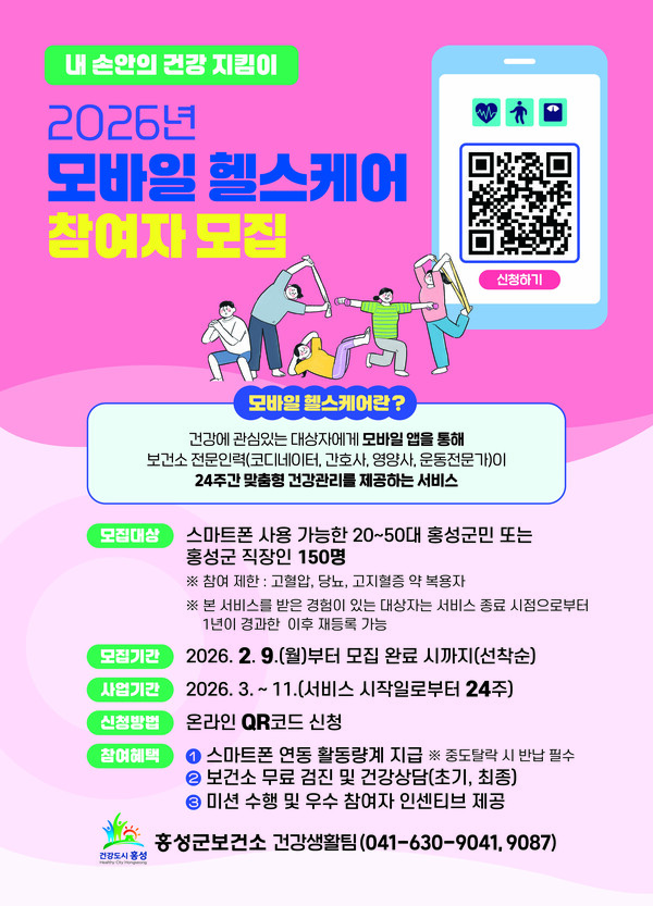 홍성군보건소(소장 정영림)는 오는 9일부터 지역주민의 건강생활실천 유도하고 만성질환을 예방하기 위해 모바일헬스케어 사업 참여자를 모집한다.