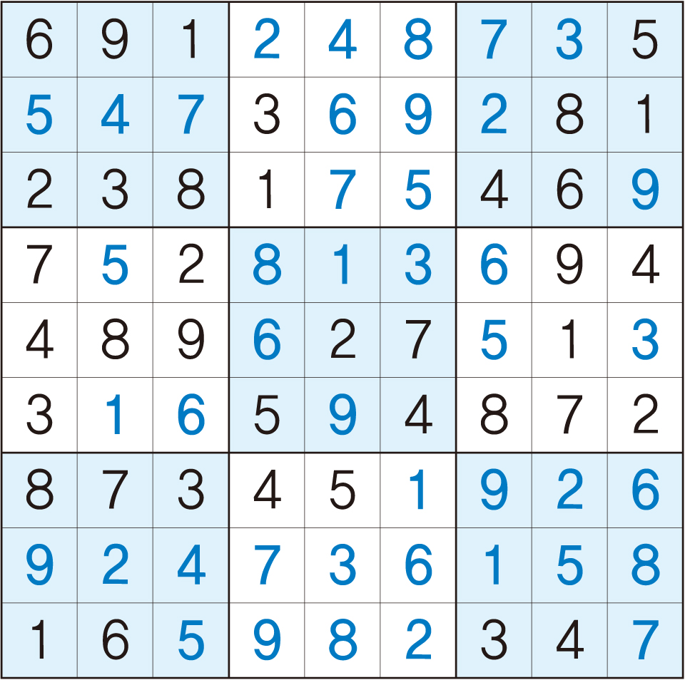 3. 큰 정사각형(9x9) 안에 있는 작은 정사각형(3x3) 안에는 숫자 1~9가 각 한 번씩 들어간다.