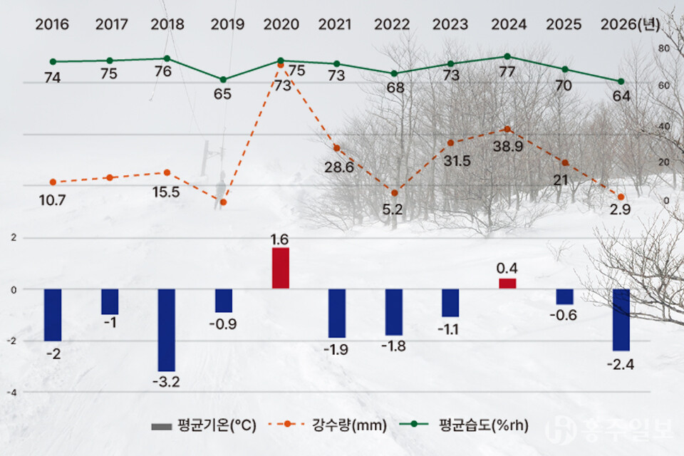 이 같은 흐름은 홍성군 자료에서도 유사한 양상을 보였다. 홍성군의 최근 10년간 1월 기온 흐름을 살펴보면, 대부분의 해는 비교적 완만한 겨울 양상을 보였으나 2018년과 2026년은 다른 해와 비교해 기온 하강 폭이 상대적으로 뚜렷하게 나타난 시점으로 구분된다. 2018년 1월 평균기온은 -3.2℃, 2026년 1월은 -2.4℃로, 상대적으로 낮은 수준을 기록했다.