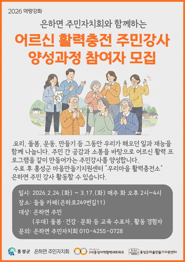 은하면주민자치회는 홍성군마을만들기지원센터와 함께 지역 내 어르신 돌봄과 마을 공동체 활성화를 위해 ‘어르신 활력충전 주민강사 양성과정’ 참여자를 모집한다.