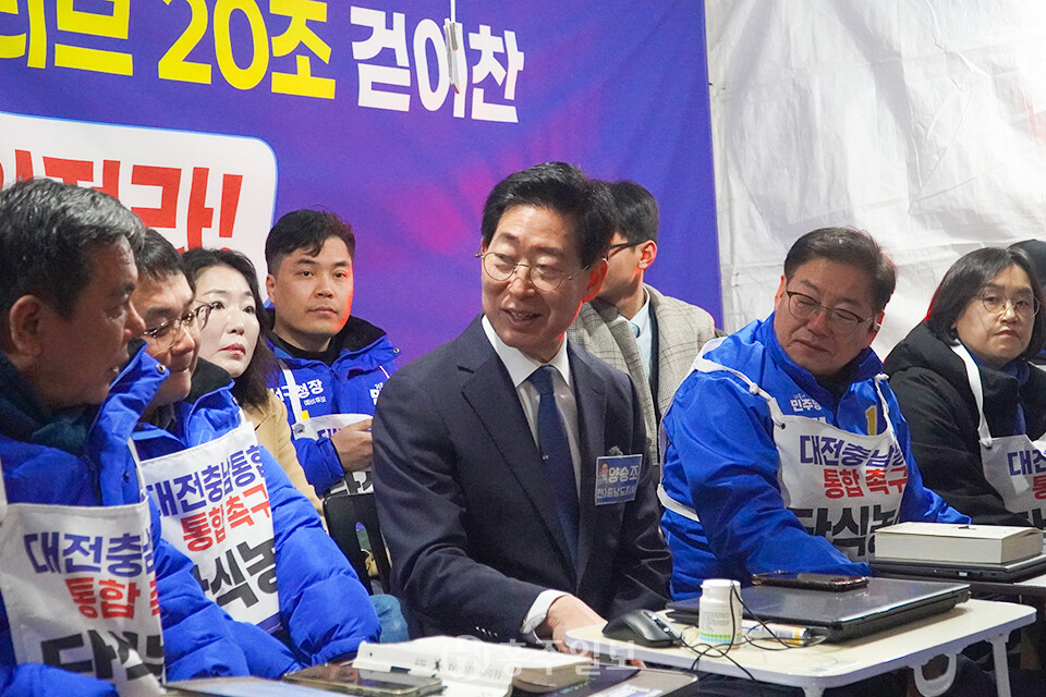 이날 행사 직후 양 전 지사는 대전시청 북문 앞 천막 농성장을 방문했다. 이곳에서는 더불어민주당 대전시당이 ‘20조 원 지원·공공기관 이전 무산 규탄 및 대전·충남 통합 촉구’를 내걸고 릴레이 단식 농성을 이어가고 있다. 양 전 지사는 농성 참여자들을 만나 “통합의 불씨를 지키는 분들”이라며 격려했다.