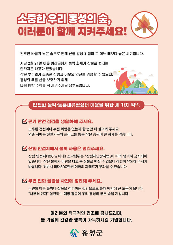 홍성군은 이번 조치를 계기로 산림 인접 시설 중심의 자율 안전관리 체계를 강화하고, 지속적인 홍보와 점검을 병행해 화재 위험 요인을 사전에 관리해 나갈 계획이다.