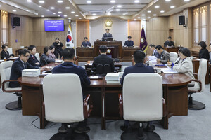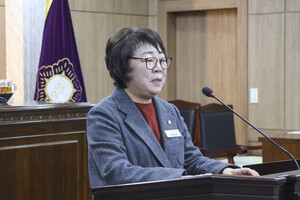 최선경 홍성군의회 산업건설위원회 위원장이 기자회견을 열고 지역사회에 큰 이슈가 됐던 복개주차장 철거가 포함된 ‘홍성천지구 풍수해생활권 종합정비사업’ 관련 예산 일부를 삭감한 배경을 설명하고 있다.
