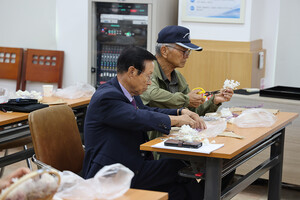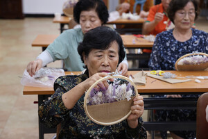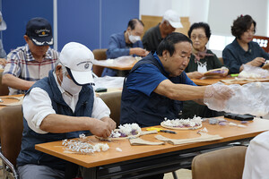 실습 교육을 통해 제작한 벽걸이 장식을 들어보이며 환하게 웃고 있다.