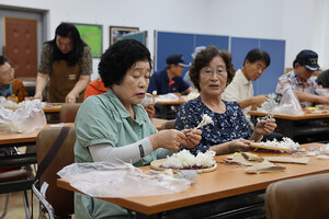갈산면주민자치회 위원들이 호국정신을 기리기 위한 가정용 국기게양대를 설치하고 있다.