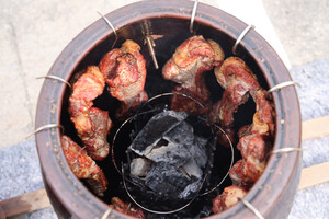 남녀노소 즐길 수 있는 다양한 바비큐 요리를 맛보고 있는 한 가족.