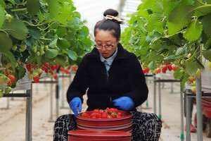 올해 첫 딸기를 출하한 금마면 화양리 으뜸딸기농원 김수연 씨가 딸기를 수확하고 있다.