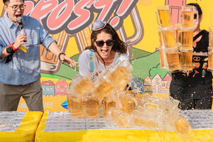 남해 독일마을 맥주축제에 참여한 한 외국인 관광객이 대형 맥주잔을 들어보이며 환하게 웃고 있다.