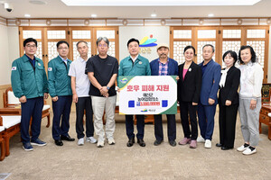 예산소방서 전영수 서장이 예산소방서의용소방대연합회기를 인계하며 수치(綬幟)를 달아주고 있다.