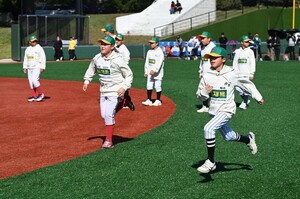 유소년 선수들과 한화이글스 치어리딩팀이 역동적인 포즈를 취한채 기념촬영을 하고 있다.