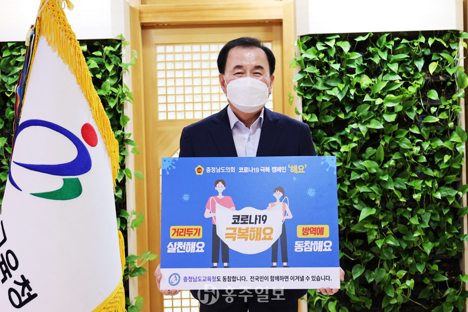 충남교육청 김지철 교육감이 충남도의회(의장 김명선)가 추진하고 있는 “코로나19 극복해요”의 ‘해요’ 캠페인에 동참했다.<사진>