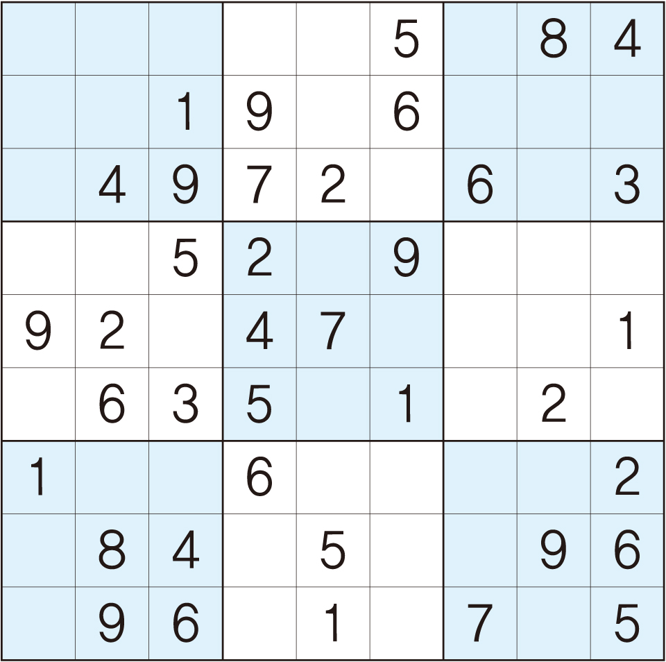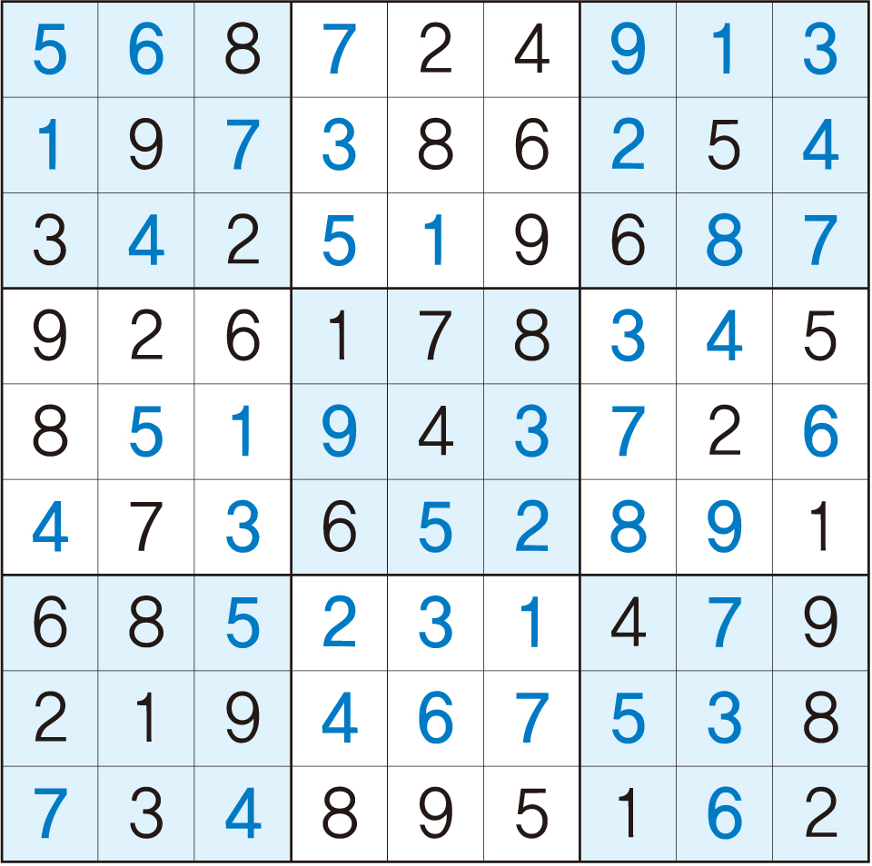 3. 큰 정사각형(9x9) 안에 있는 작은 정사각형(3x3) 안에는 숫자 1~9가 각 한 번씩 들어간다.