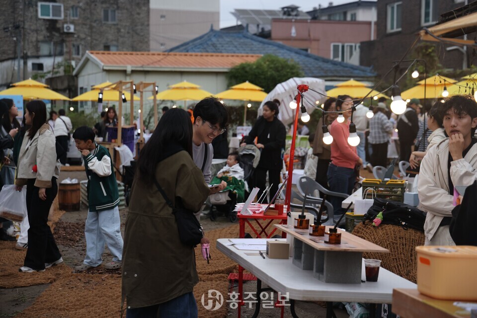 특히 문화도시 조성사업 ‘홍자람’의 특화 프로그램인 ‘풍요의 땅 프로젝트’를 통해 오랫동안 비어 있던 홍고통 공터가 커뮤니티 가든으로 새롭게 탄생했다. 조성을 맡은 ‘노디씨드’는 유기농과 농업을 보다 쉽게 접할 수 있도록 캐릭터 디자인을 활용해 다양한 굿즈를 제작·소개하는 브랜드로, 이번 공간을 도시 생태문화와 공동체 정원을 실험하는 장으로 꾸몄다.
