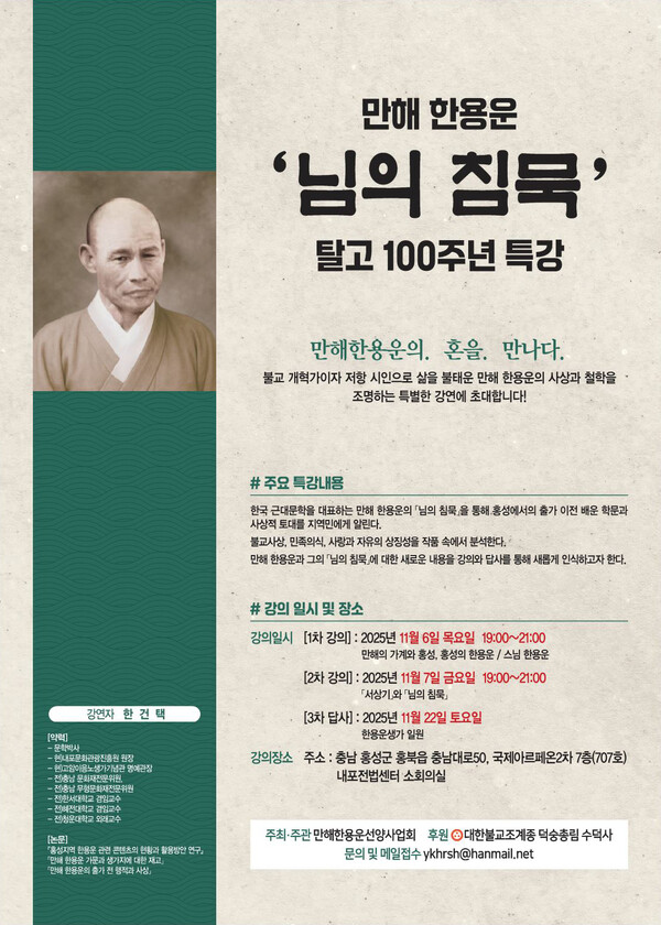 이번 강좌는 ‘2025년 만해 한용운 <님의 침묵> 탈고 100주년’을 기념해 기획됐으며, 오는 다음달 6일과 7일 이틀간 강의가 진행되고, 22일에는 만해 한용운 생가 일원에 대한 문화답사가 예정돼 있다.