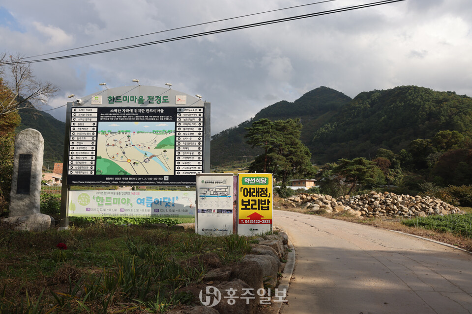 ‘한드미’라는 이름의 뿌리도 흥미롭다. 순우리말인 ‘한드미’라는 이름은 순우리말로 ‘넓은 들판’을 뜻하는데, 산지가 많은 단양지역에서 드물게 비교적 평지가 펼쳐져 있어 농업에 유리했던 지형적 특징을 반영한다. 주민들은 농업을 중심으로 삶을 이어왔다. 그래서 공식 지명은 ‘어의곡리’이지만, 주민들 사이에선 예부터 ‘한드미마을’로 불리며 정체성을 이어온 마을이다.