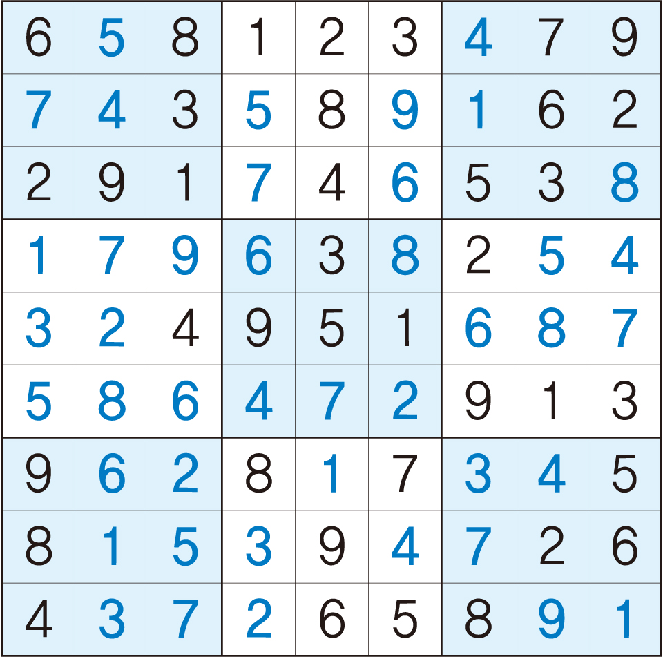 3. 큰 정사각형(9x9) 안에 있는 작은 정사각형(3x3) 안에는 숫자 1~9가 각 한 번씩 들어간다.