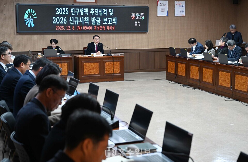 홍성군은 지난 8일 군청 회의실에서 ‘2025년 인구정책 추진실적 및 2026년 신규 시책 발굴 보고회’를 열고, 올해 추진한 인구정책 실적을 점검하는 한편 내년 신규 시책 추진계획을 공유했다.<사진>