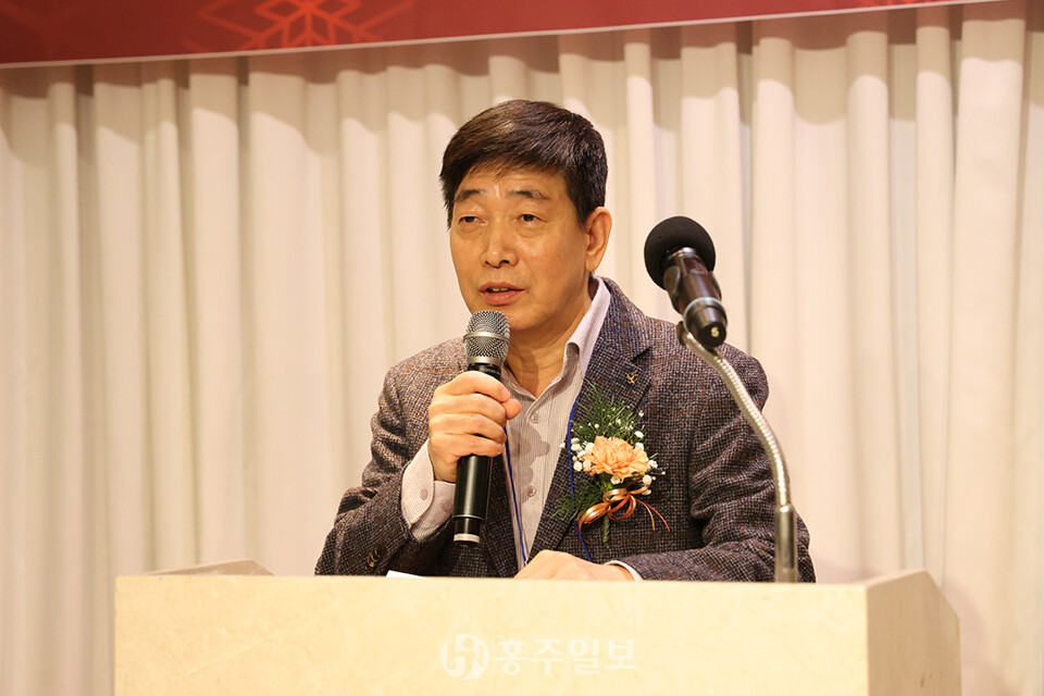 이영철 이임회장이 이임사에서 지난 임기 간 아쉬움을 달래며, 새롭게 구성을 마친 집행부의 앞날에 응원의 메시지를 전하고 있다.