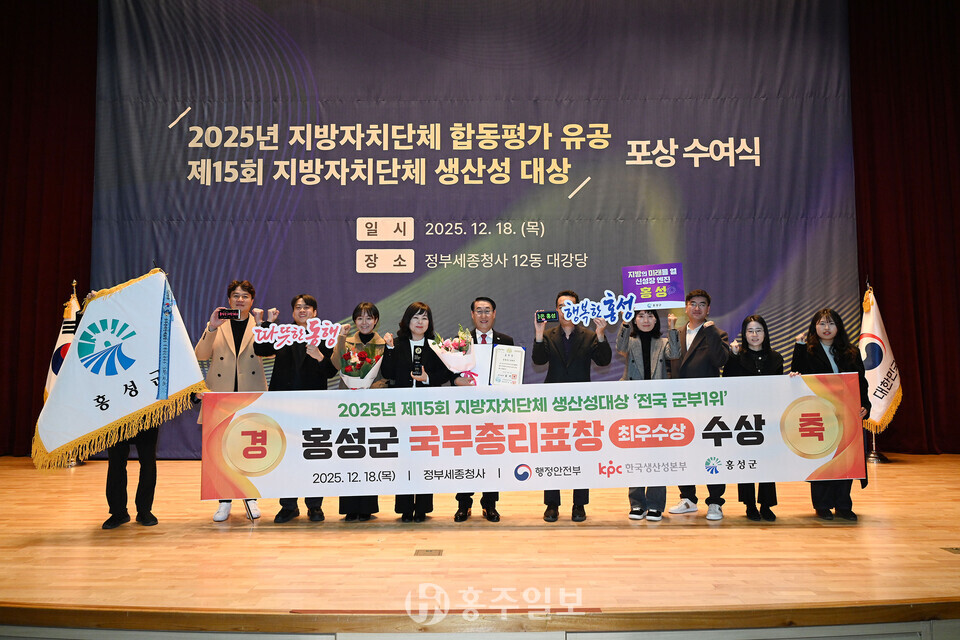 홍성군이 전국 지방자치단체 생산성 평가에서 종합 1위를 달성하며 국무총리 표창 수상의 영예를 안았다. 군에 따르면 지난 18일 정부세종청사에서 열린 ‘제15회 지방자치단체 생산성대상’에서 홍성군은 전국 군부 1위를 기록했다.<사진>