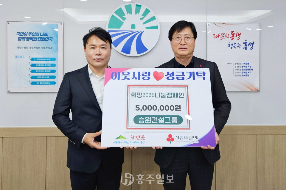 승원건설그룹(회장 김승구)은 지난 16일 광천읍에 방문해 ‘희망2026 나눔캠페인’ 이웃사랑 성금 500만원을 기탁했다. 성금은 충남 사회복지공동모금회를 통해 광천읍의 저소득층과 복지사각지대 주민들에게 지원될 예정이다.