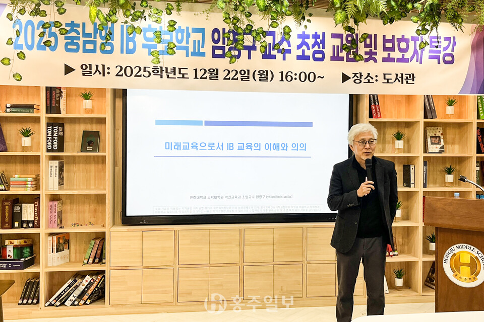 [홍주일보 홍성=한기원 기자] 홍주중학교(교장 유영석)는 지난 22일 교사와 학부모를 대상으로 임영구 교수를 초청해 특강을 열고, IB 후보학교로서 학교가 지향하는 교육 방향과 교육과정 운영의 의미를 공유했다.