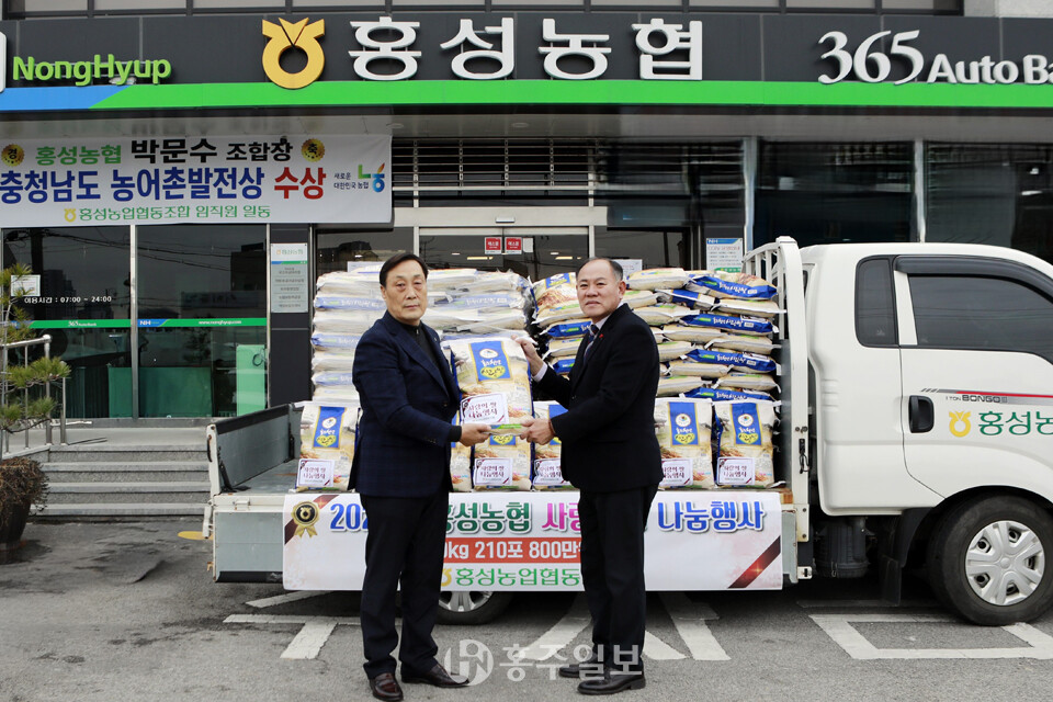 홍성농업협동조합(조합장 박문수)은 지난해 12월 23일 홍성농협 본점에서 유철식 홍성읍장이 참석한 가운데 ‘사랑의 쌀 나눔행사’를 진행하고 800만 원 상당의 사랑쌀 10kg(210포)를 기탁했다. 쌀은 어려운 이웃과 사회복지단체에 전달됐다.