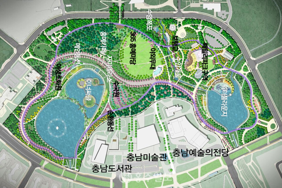정비가 완료되면 홍예공원은 패밀리파크, 웅비광장, 별빛자미원 등으로 구역이 나뉘어 △어린이 놀이시설·물놀이 공간 △스케이트장 △대형 야외무대 △잔디광장 △테마형 산책로 △황톳길 △홍예쉼터 등을 갖춘 도심 속 체류형 공원으로 재편될 예정이다. 충남도는 문화시설 완공 이전이라도 시민들이 체감할 수 있는 생활 공간을 먼저 열어 내포신도시의 일상성과 이용 밀도를 높인다는 구상이다.