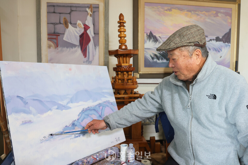[홍주일보 홍성=이정은 기자] 결성면 출신의 조운선(86) 씨는 자신을 “평균적인 능력을 가진 시골 사람”이라 소개한다. 그러나 그의 삶을 따라가 보면, ‘평범함’ 속에 깊이 스며 있는 예술적 감수성과 끈질긴 성실함이 한 사람의 인생을 어떻게 예술로 확장시켜 왔는지 고스란히 드러난다. 그는 교직 생활 35년, 그리고 그보다 더 길었던 창작의 시간을 지나 오늘도 붓을 들고, 악기를 연주하고, 자연을 바라보며 삶의 흔적을 기록하고 있다.