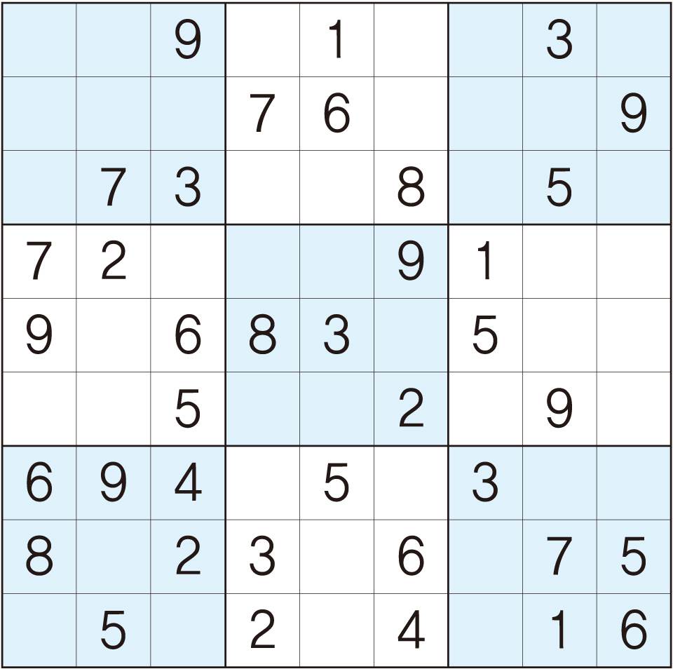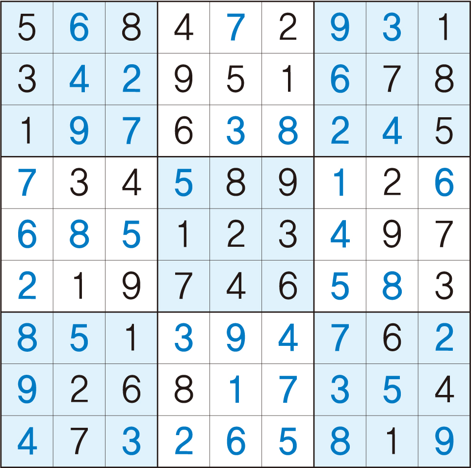 3. 큰 정사각형(9x9) 안에 있는 작은 정사각형(3x3) 안에는 숫자 1~9가 각 한 번씩 들어간다.