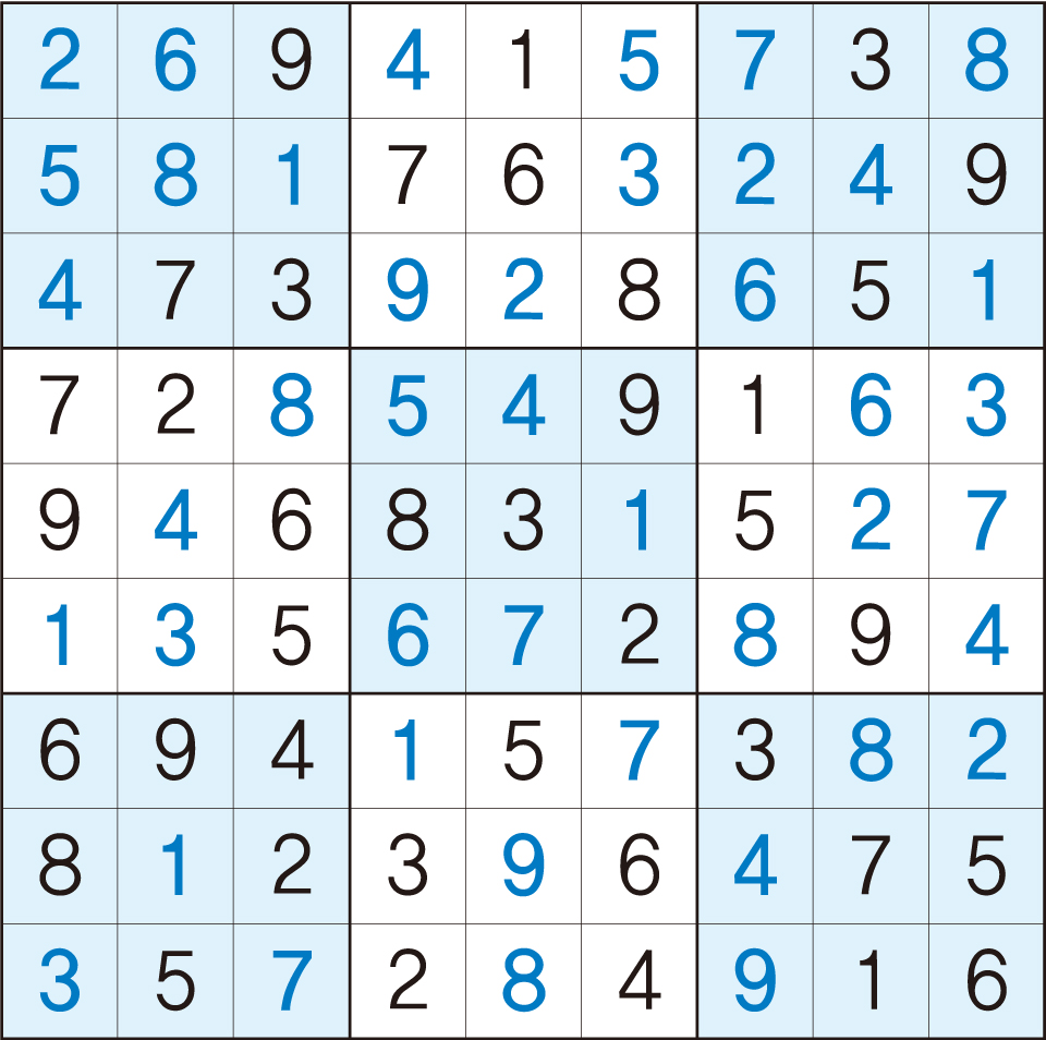 3. 큰 정사각형(9x9) 안에 있는 작은 정사각형(3x3) 안에는 숫자 1~9가 각 한 번씩 들어간다.