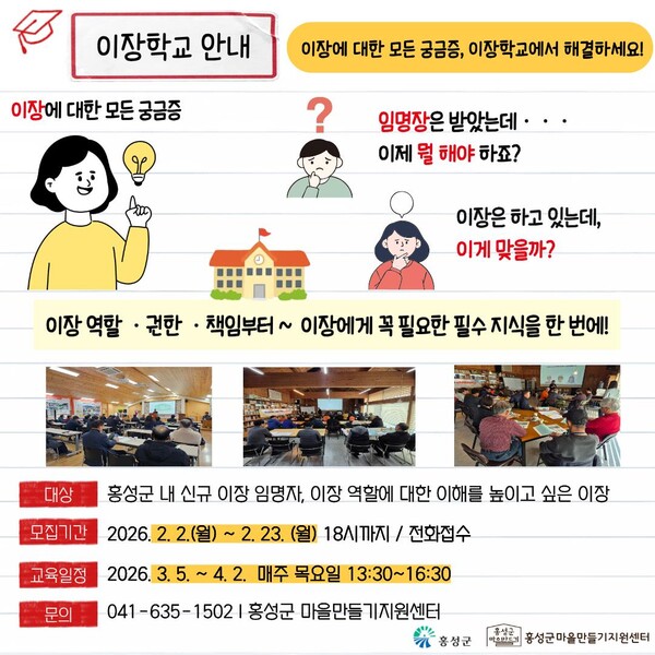 이장학교는 이장과 마을리더를 대상으로 운영되며, 리더의 역할, 마을규약 등 마을 운영 전반에 필요한 기본 사항을 중심으로 교육을 진행할 예정이다. 교육은 3월 5일부터 4월 2일까지 매주 목요일 오후 1시 30분부터 4시 30분까지 진행되며 총 5회차 과정이다.