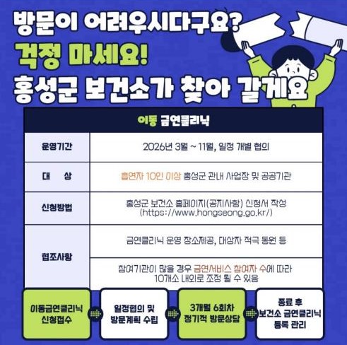 홍성군보건소(소장 정영림)는 군민들의 흡연율 감소와 건강 증진을 위해 금연을 원하는 직장인들을 대상으로 실시하는 '이동금연클리닉'에 참여할 기관을 모집한다.