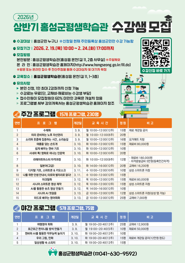홍성군평생학습관에서는 △미리 준비하는 노후 자산관리 △영화로 떠나는 인문학 △디지털 기초 스마트폰·키오스크 활용 과정 등 군민의 실생활과 밀접한 맞춤형 프로그램 20개를 운영하며, 총 305명을 모집한다.