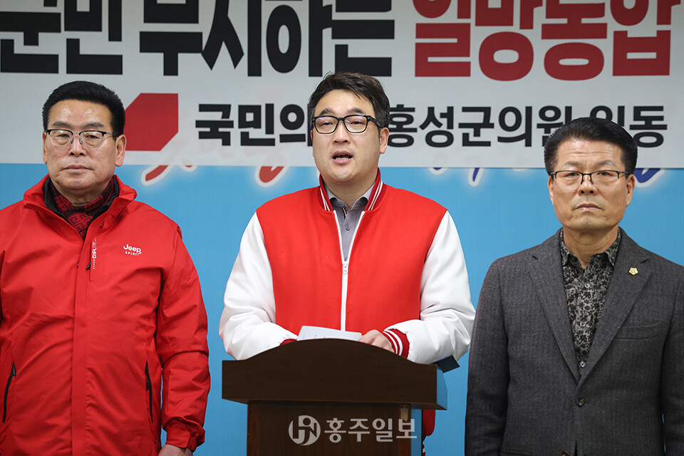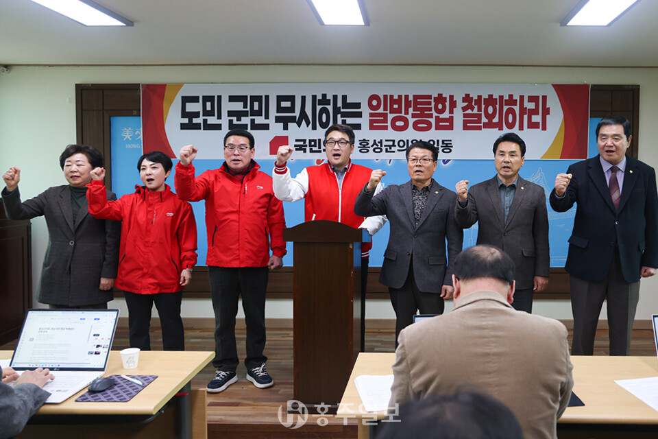 [홍주일보 홍성=김용환 기자] 충남·대전 행정통합 관련 특별법안 대안이 지난 12일 국회 행정안전위원회를 통과하며 통합 논의가 속도를 내고 있는 가운데, 홍성군의회 국민의힘 소속 의원들이 기자회견을 열고 행정통합에 대해 분명한 반대 입장을 밝혔다.
