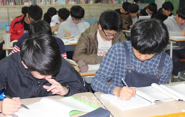 2016학년도 대학수학능력시험이 28일 앞으로 다가왔다. 마지막 한 달 가량을 어떻게 보내느냐에 따라 수능의 성패여부가 좌우된다 해도 과언이 아니다. 지난 12일, 수능을 앞둔 수험생들이 공부하고 있는 홍성고등학교 3학년의 한 교실을 찾았다. 막바지 수능 공부를 하고 있는 수험생들의 비장한 눈빛과 표정에서는 전운(戰運)마저 감돌고 있었다.
