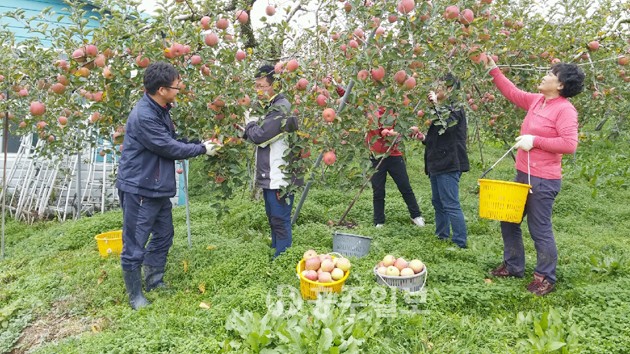 홍동면사무소(면장 박경화) 직원 15명은 지난 11일 홍동면 화신리 이후근 씨 과수원(0.83ha, 사과나무 400수)에서 가을철 사과따기 농촌일손돕기활동을 실시했다. 저작권자 © 홍주일보 무단전재 및 재배포 금지 홍주일보 다른기사 보기 페이스북 카카오톡 URL복사 기사공유하기