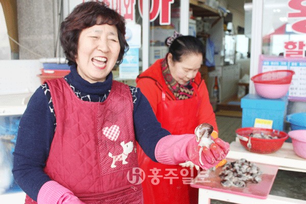 【서부】제13회 홍성 남당항 새조개축제가 진행중인 가운데 살이 통통하게 오른 새조개를 맛보러 남당항을 찾는 방문객이 증가하고 있다. 사진은 손질한 새조개를 들어보이며 환하게 웃고 있는 남당리 주민의 모습. 남당항 새조개축제는 오는 4월 30일까지 계속될 예정이다.