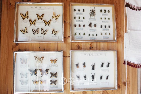 특히 펜션농장의 또 다른 특징은 다양한 곤충 표본과 사진도 마련돼 있어 아이들의 흥미를 더욱 끈다는 점이다. 쉽게 찾아보기 어려운 물방개나 전갈 같은 곤충 표본과 사진부터 나비, 장수풍뎅이 등의 성장과정 등이 표본으로 갖춰져 있는 것이 특징이다.