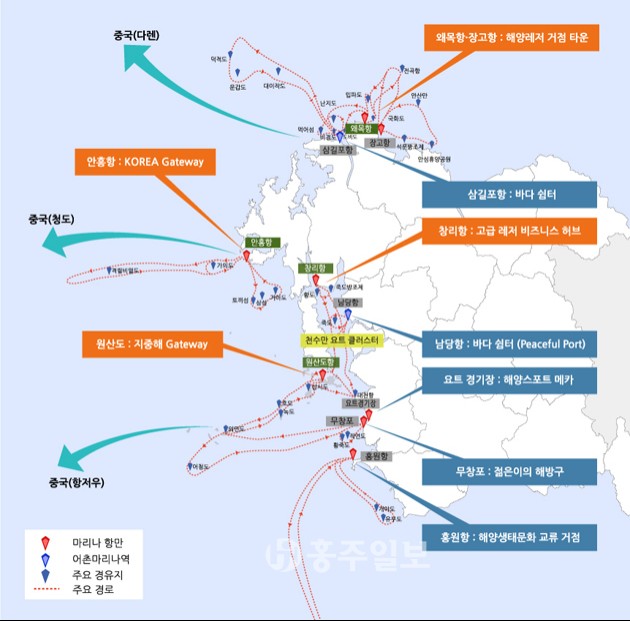 충남도는 ‘충남 마리나항만 개발 구상’을 완성하고 중점 추진해 ‘해양건도 충남’을 완성해 나아간다는 계획이다. 마리나는 레저·스포츠용 요트 등을 위한 공간으로, 방파제와 계류시설, 육상 보관 시설뿐만 아니라 숙박과 쇼핑, 테마파크 등 관광 시설도 갖춘 항구다. 도는 2030년까지 당진 왜목·장고항과 서산 창리, 보령 원산도에 200척 이상 대규모 마리나항만을 조성하는 등 서해 6개 시·군에 총 1400척 규모의 마리나 10개를 단계적으로 조성한다는 계획이다.